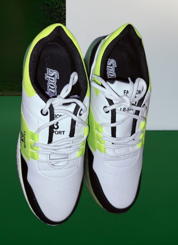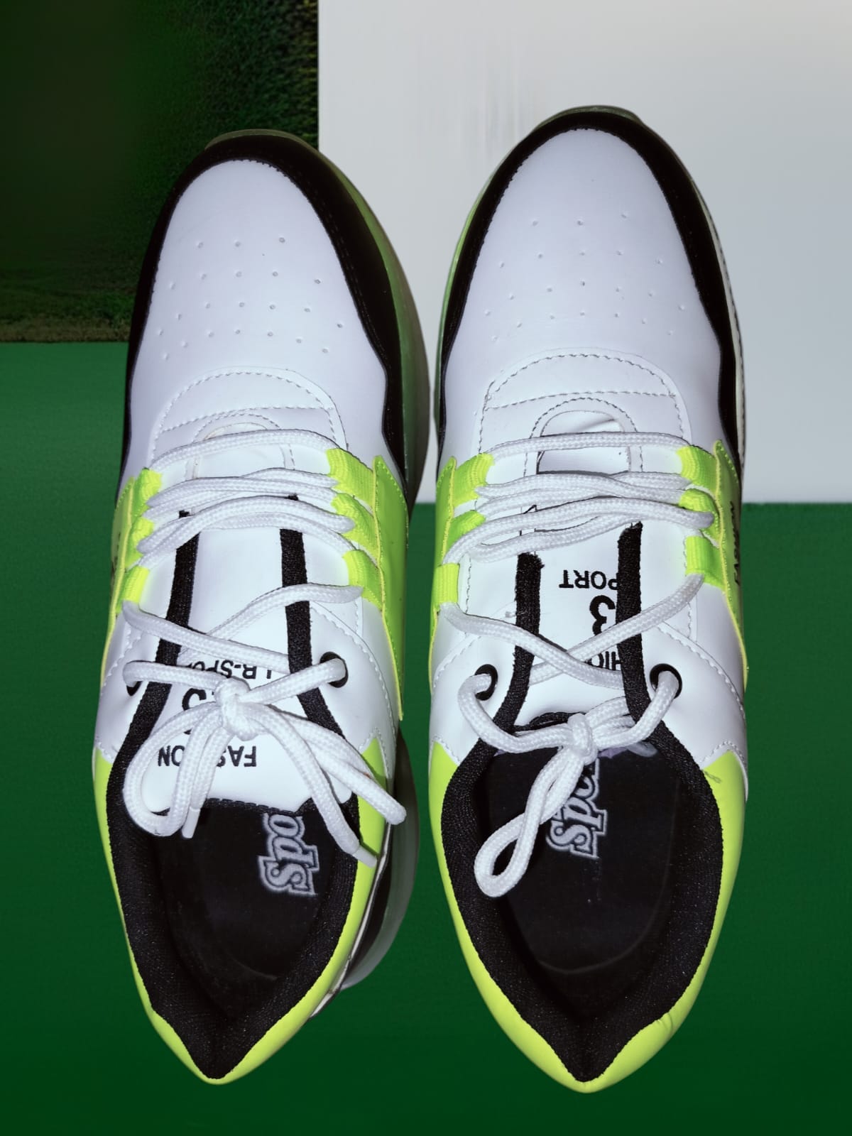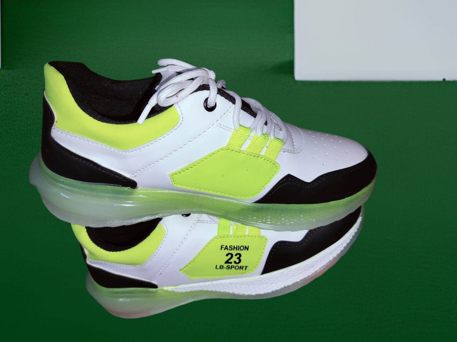 This sneaker is with a bold and sporty design. The shoes are predominantly white with black and neon green accents, giving them a trendy, eye-catching look. The upper part of the sneakers is made of synthetic leather, with perforations near the toe area for breathability. The midsole is transparent, adding a modern touch to the design